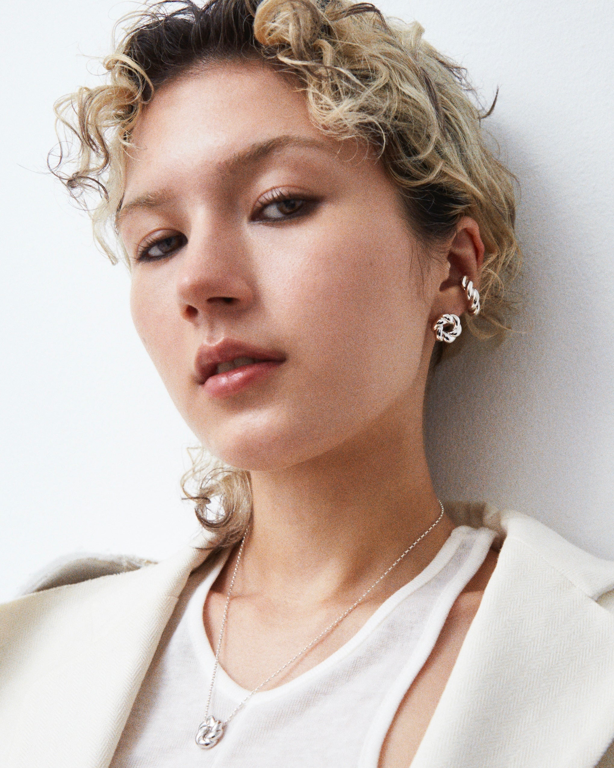 生地をこねるように作られたふんわりと渦を巻くドーナツのような愛らしいフォルムが特徴。愛着の湧くデザインは同シリーズのイヤーカフやピアスと組み合わせ多彩なスタイリングを楽しめます。Conel Loop Pierceはこちら。